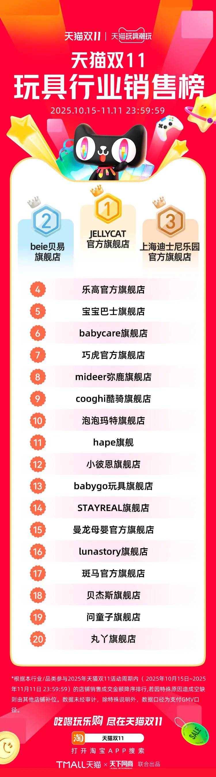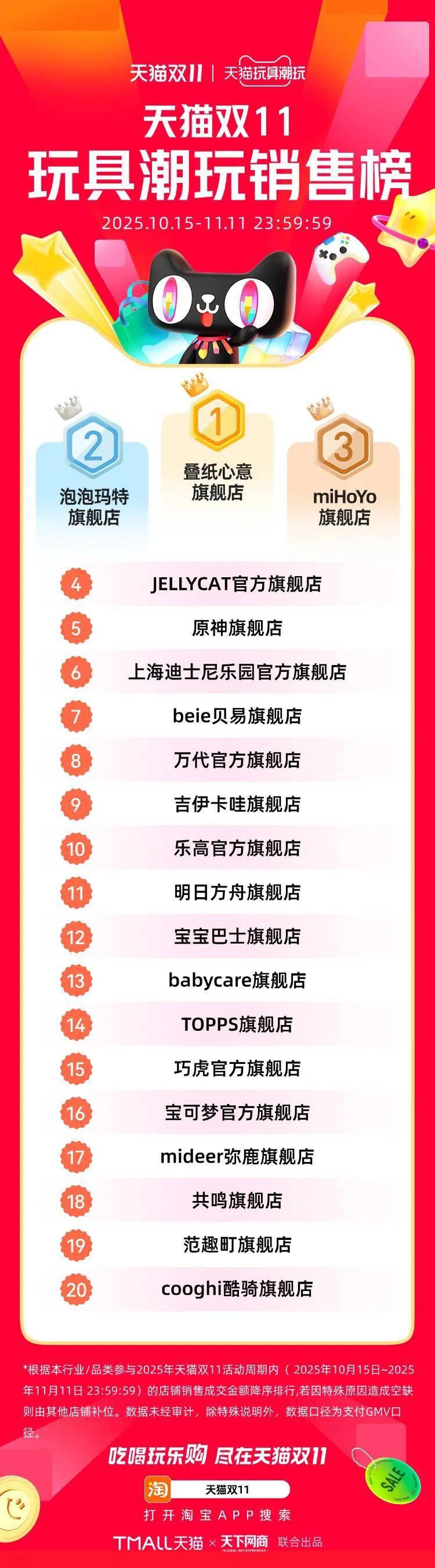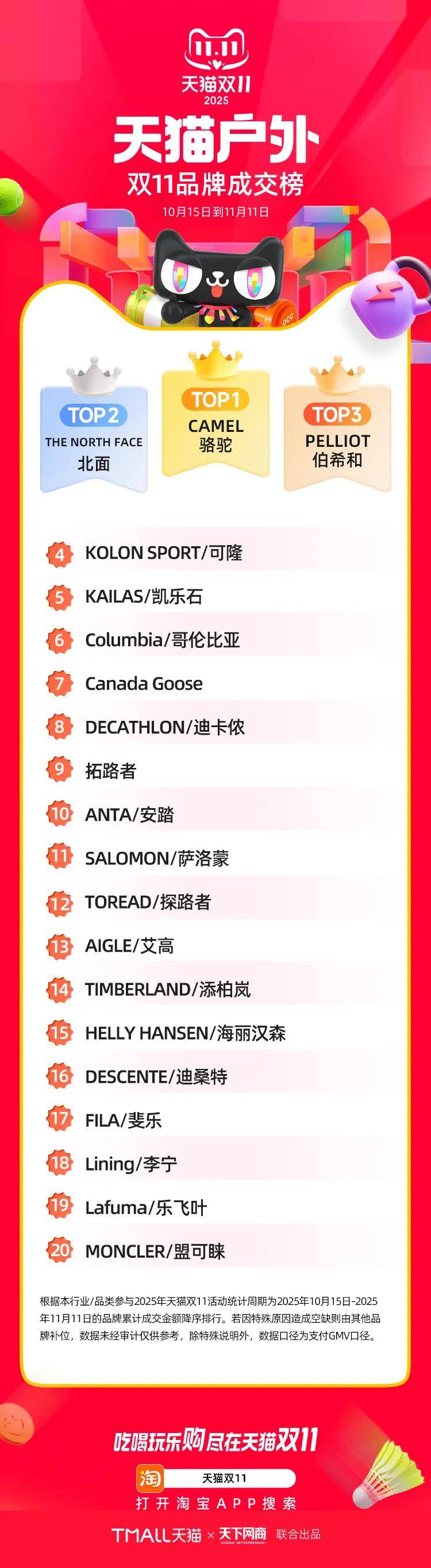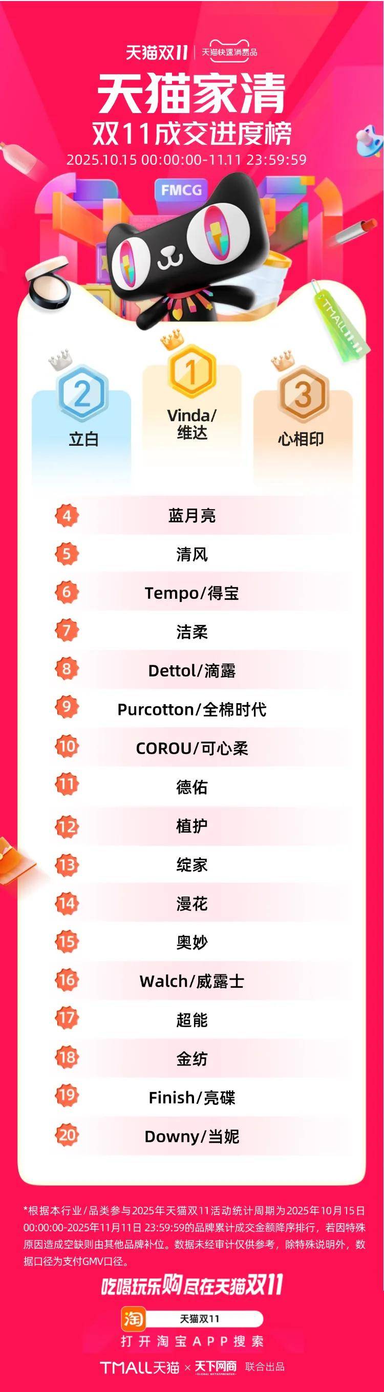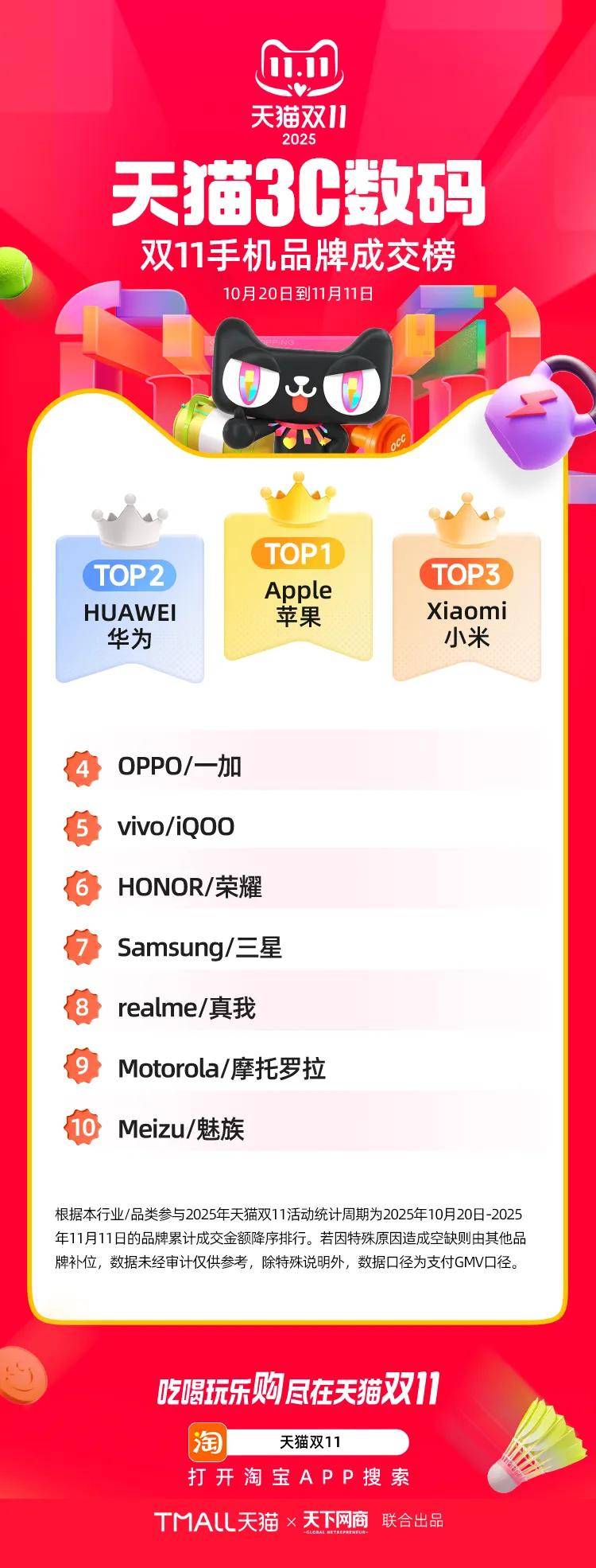 11月13日,2025天猫双11(10月15日-11月11日)品牌成交排行榜出炉,快消、服饰、运动户外、家享生活、3C数码、玩具潮玩、宠物、食品生鲜、汽车、珠宝饰品、天猫国际等行业的领跑品牌、商家出炉。
