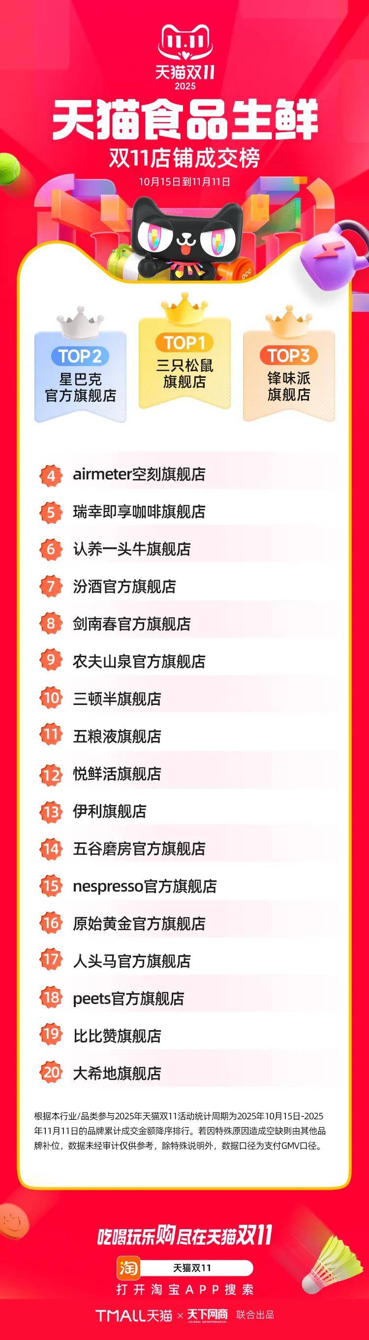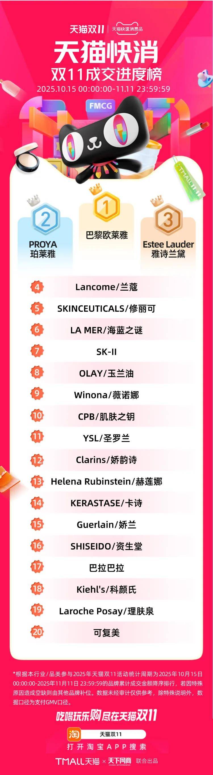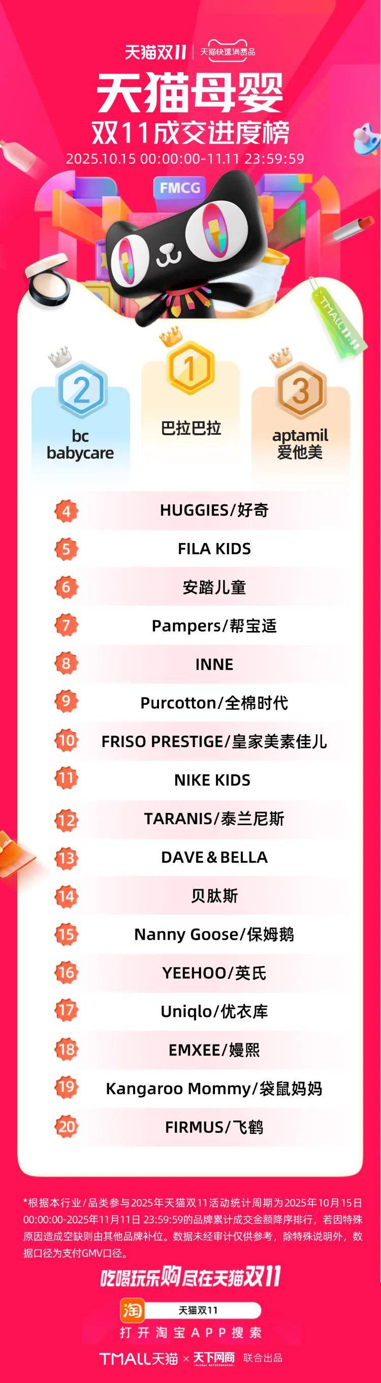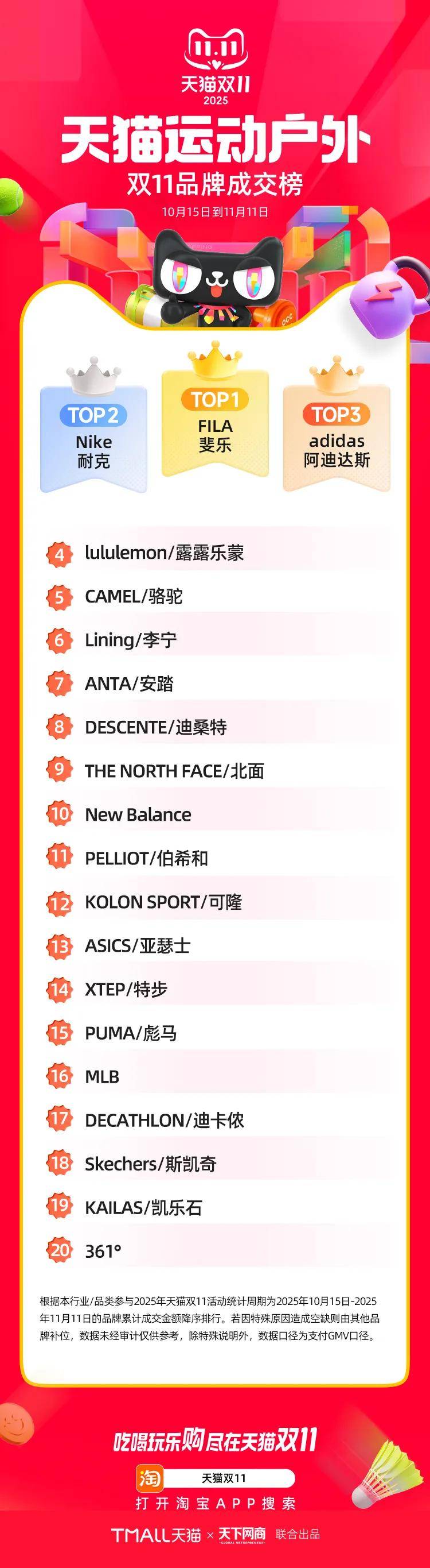 11月13日,2025天猫双11(10月15日-11月11日)品牌成交排行榜出炉,快消、服饰、运动户外、家享生活、3C数码、玩具潮玩、宠物、食品生鲜、汽车、珠宝饰品、天猫国际等行业的领跑品牌、商家出炉。