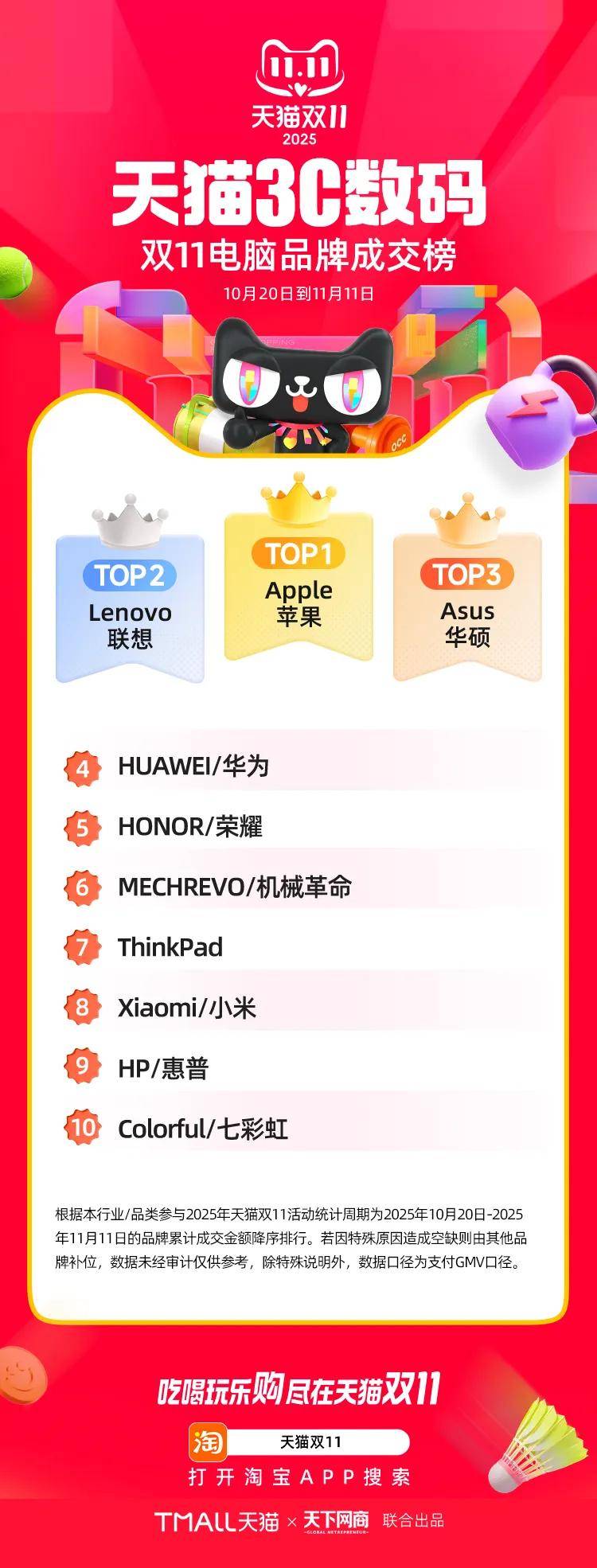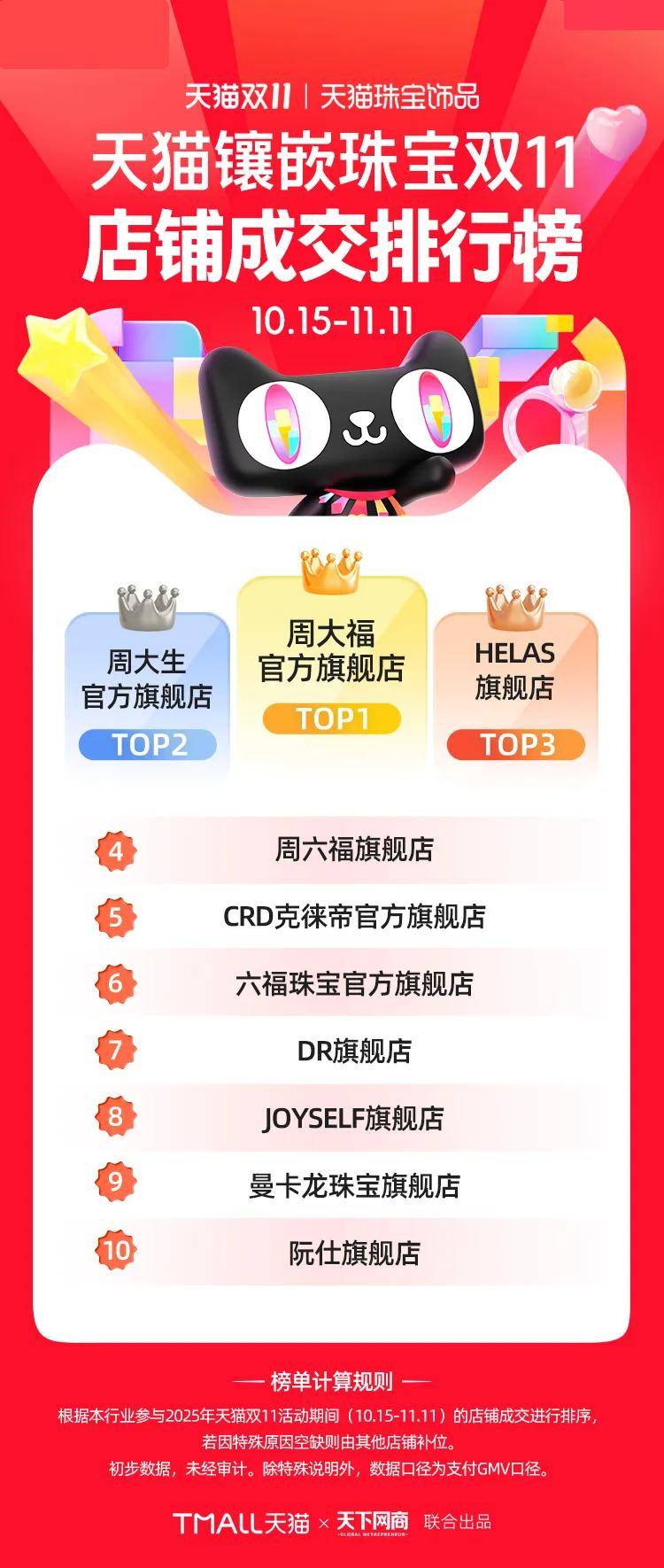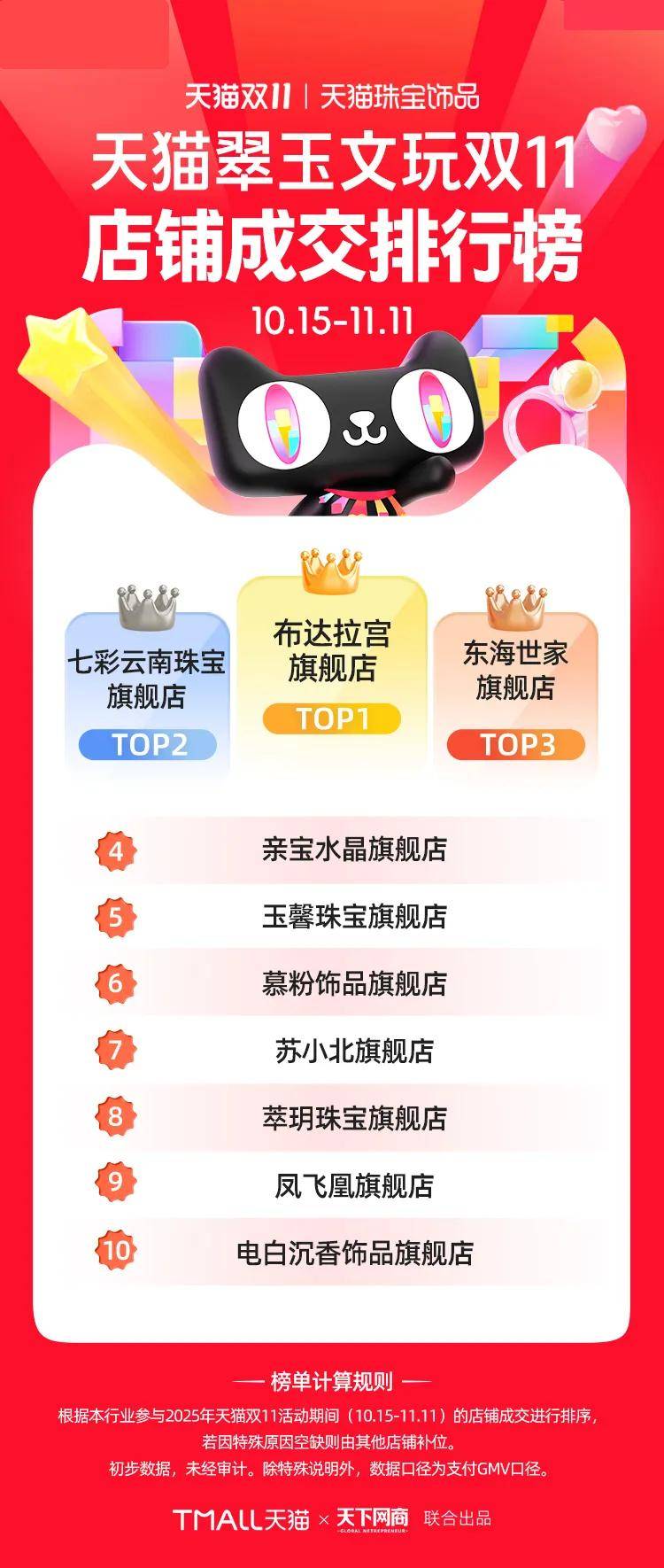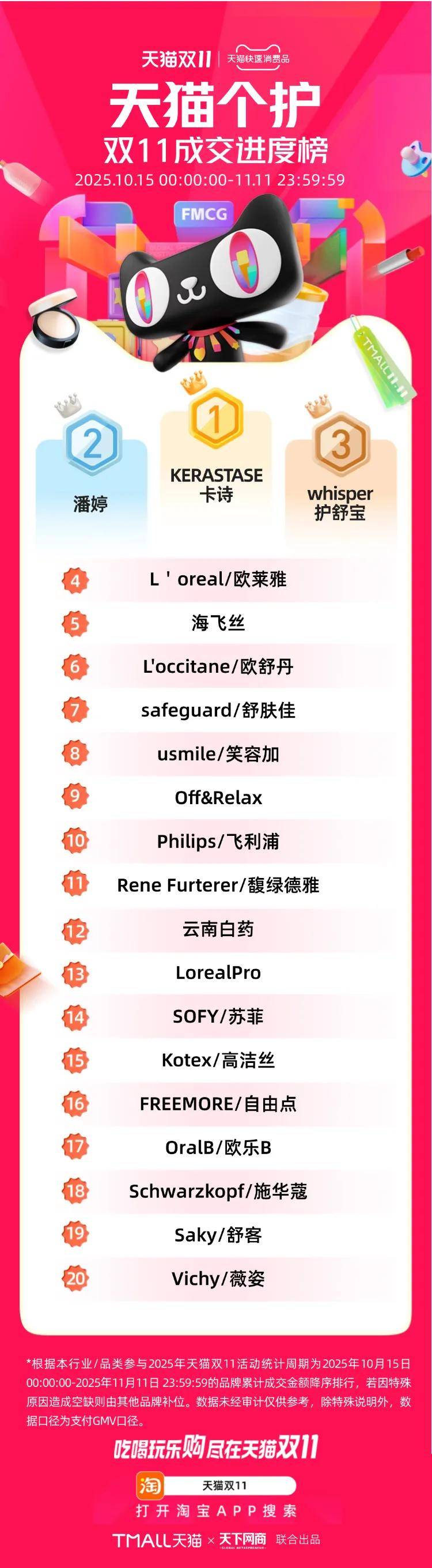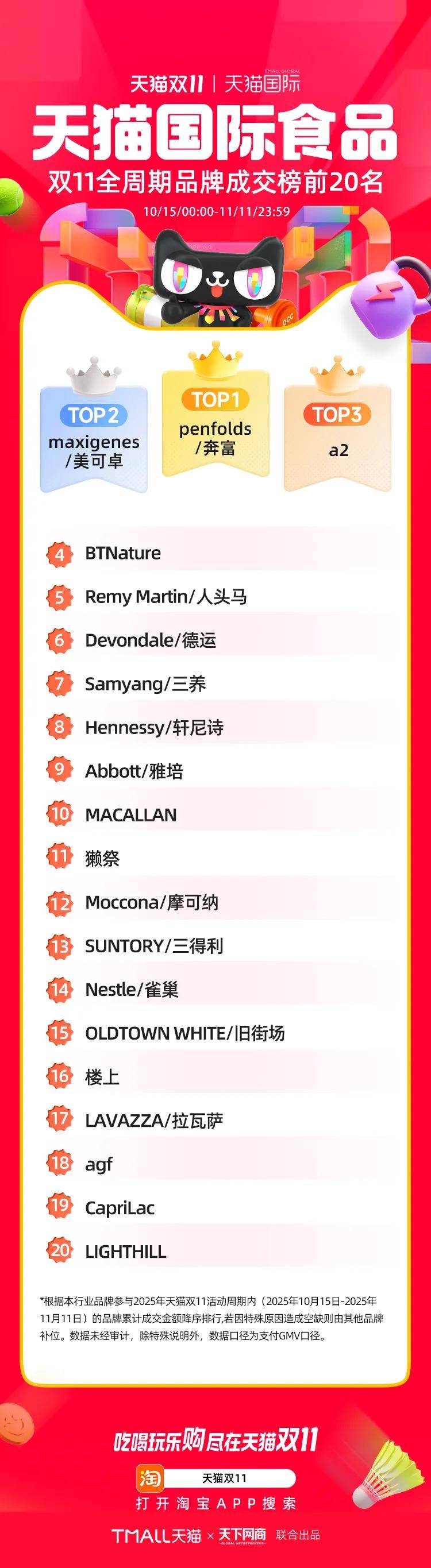 11月13日,2025天猫双11(10月15日-11月11日)品牌成交排行榜出炉,快消、服饰、运动户外、家享生活、3C数码、玩具潮玩、宠物、食品生鲜、汽车、珠宝饰品、天猫国际等行业的领跑品牌、商家出炉。