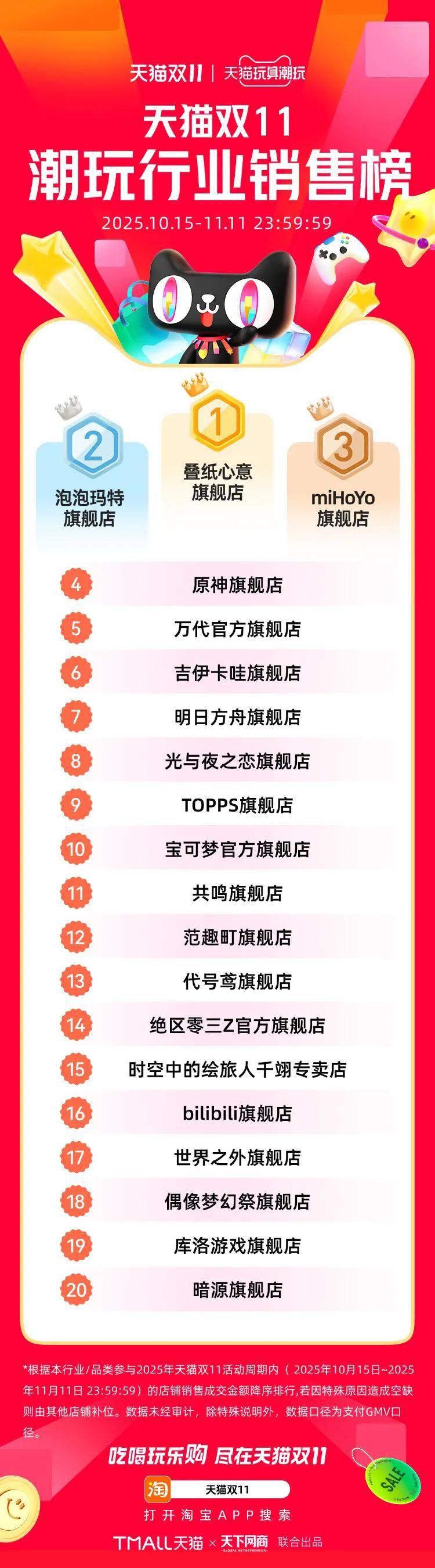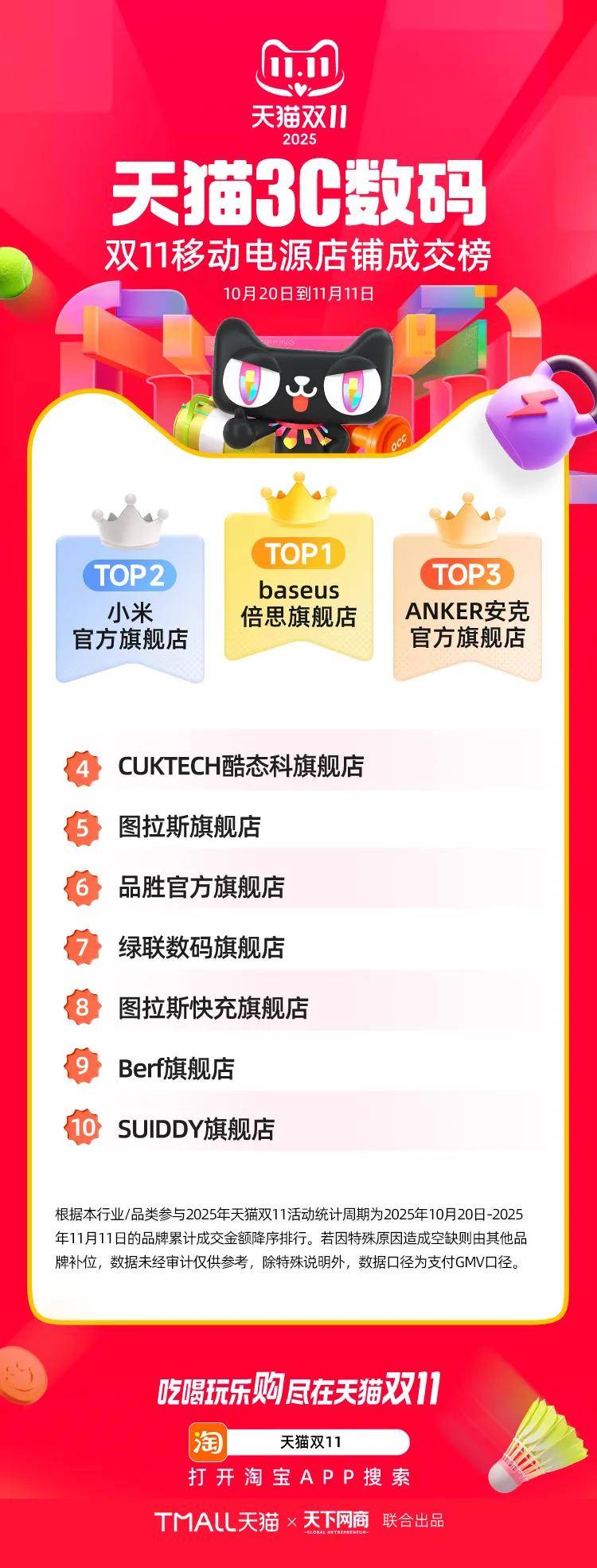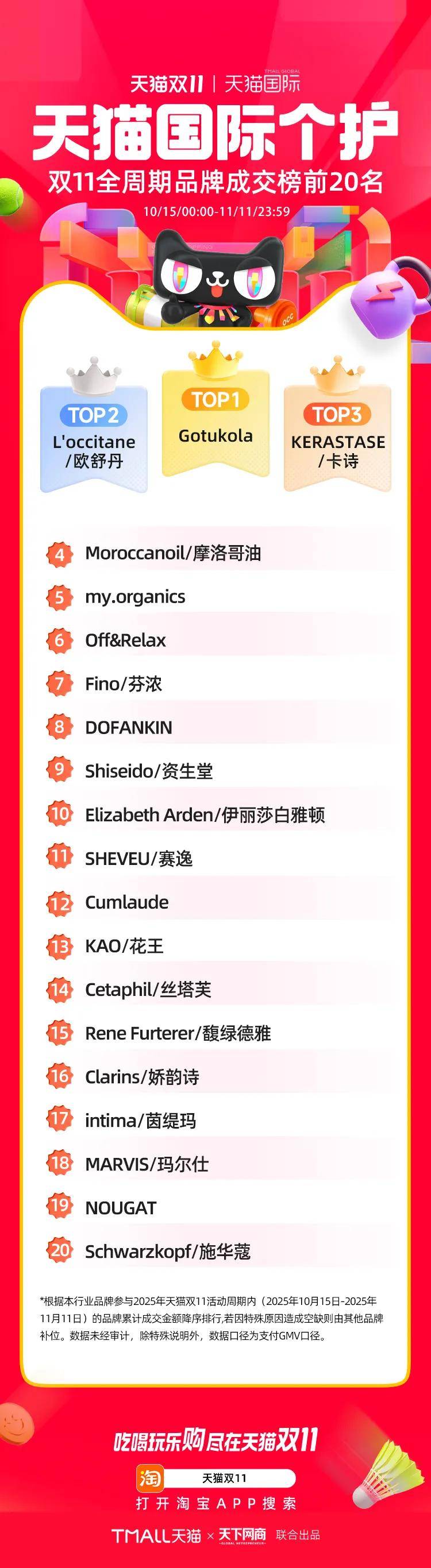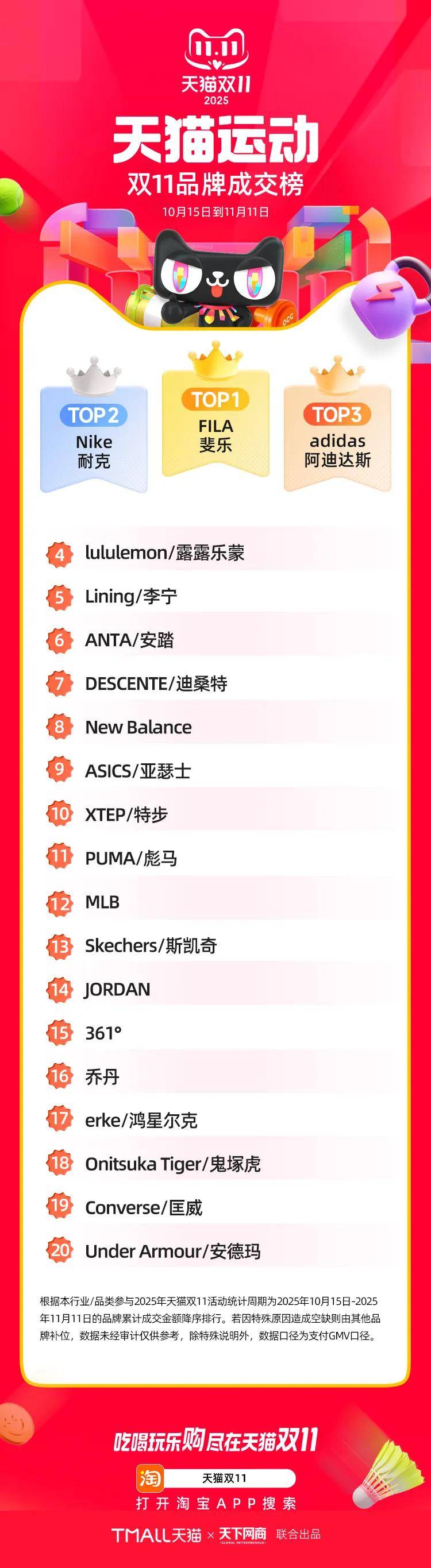 11月13日,2025天猫双11(10月15日-11月11日)品牌成交排行榜出炉,快消、服饰、运动户外、家享生活、3C数码、玩具潮玩、宠物、食品生鲜、汽车、珠宝饰品、天猫国际等行业的领跑品牌、商家出炉。