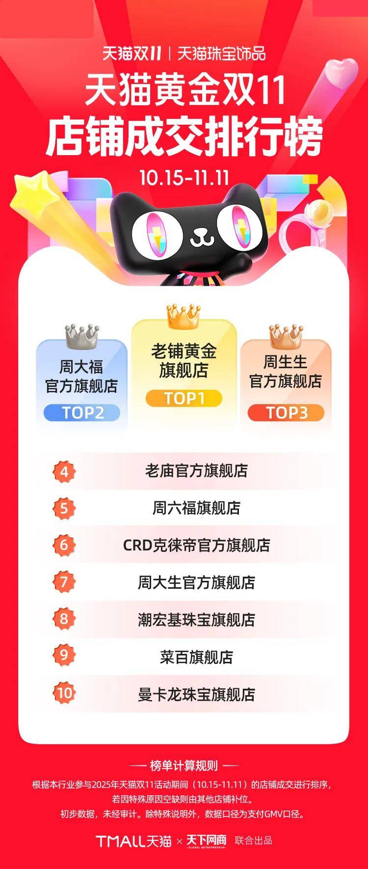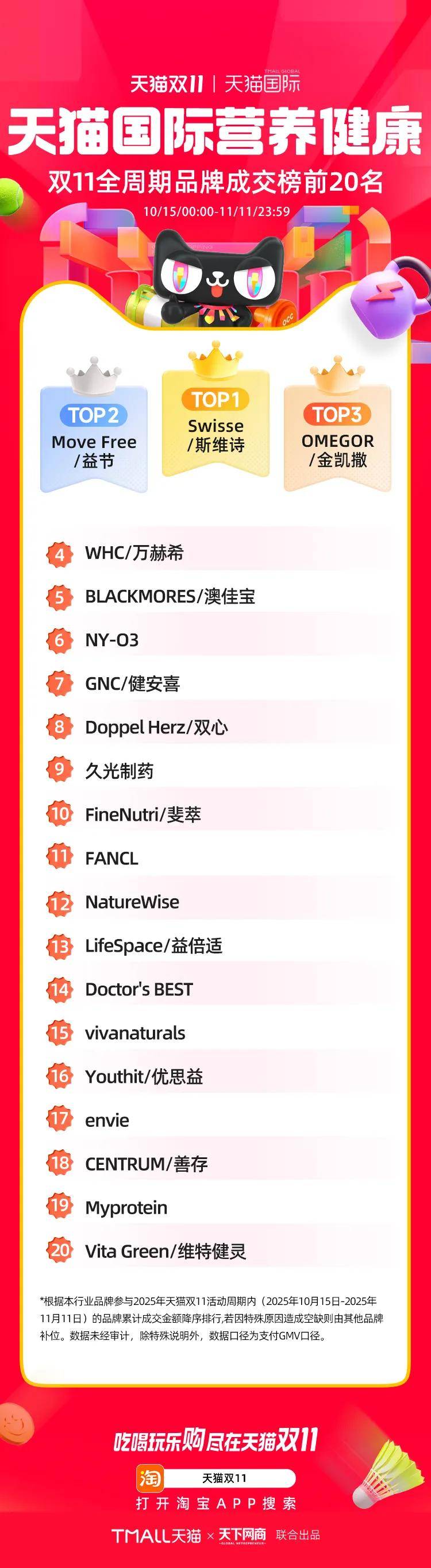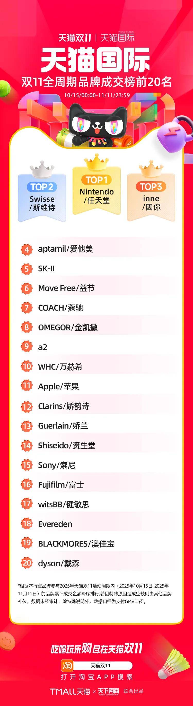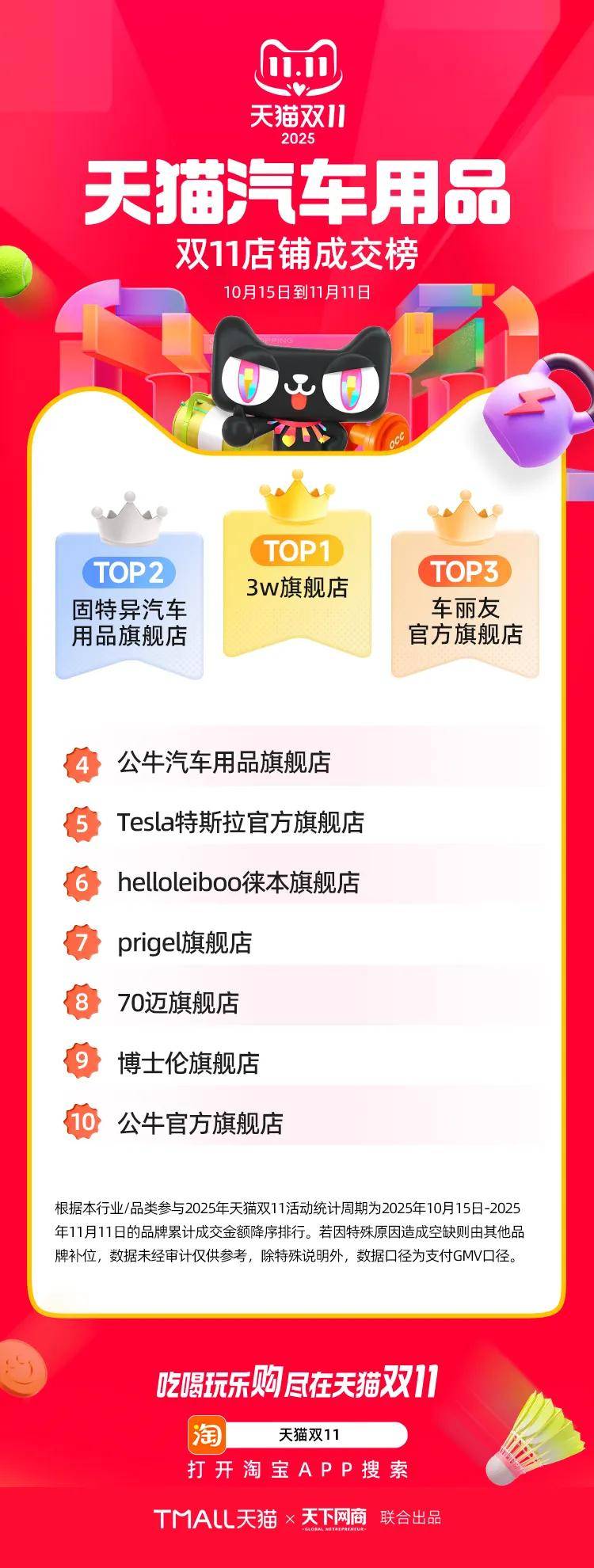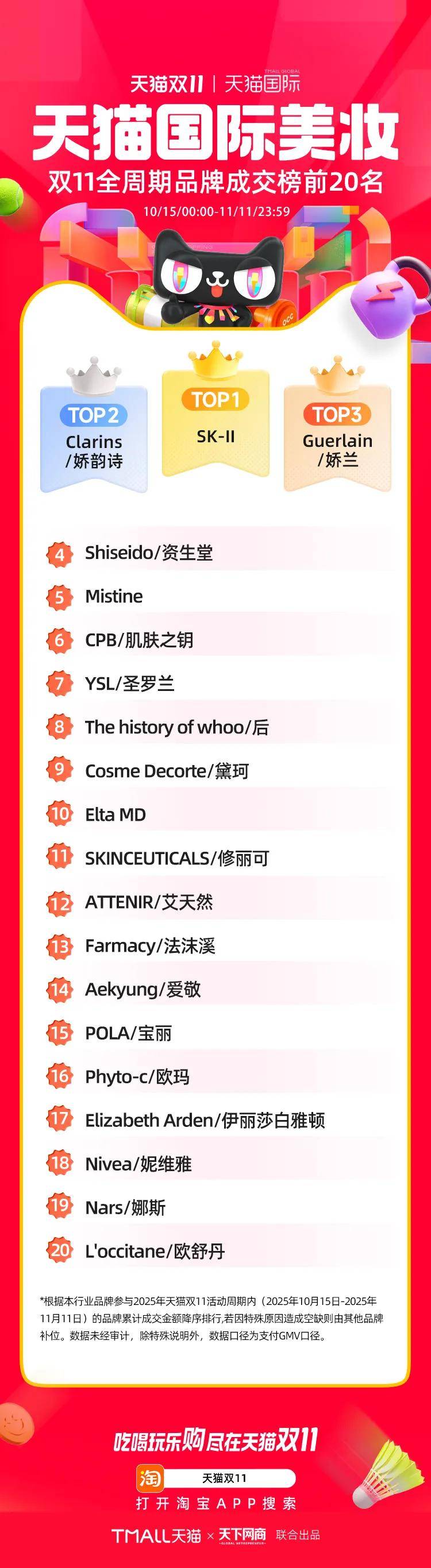 11月13日,2025天猫双11(10月15日-11月11日)品牌成交排行榜出炉,快消、服饰、运动户外、家享生活、3C数码、玩具潮玩、宠物、食品生鲜、汽车、珠宝饰品、天猫国际等行业的领跑品牌、商家出炉。