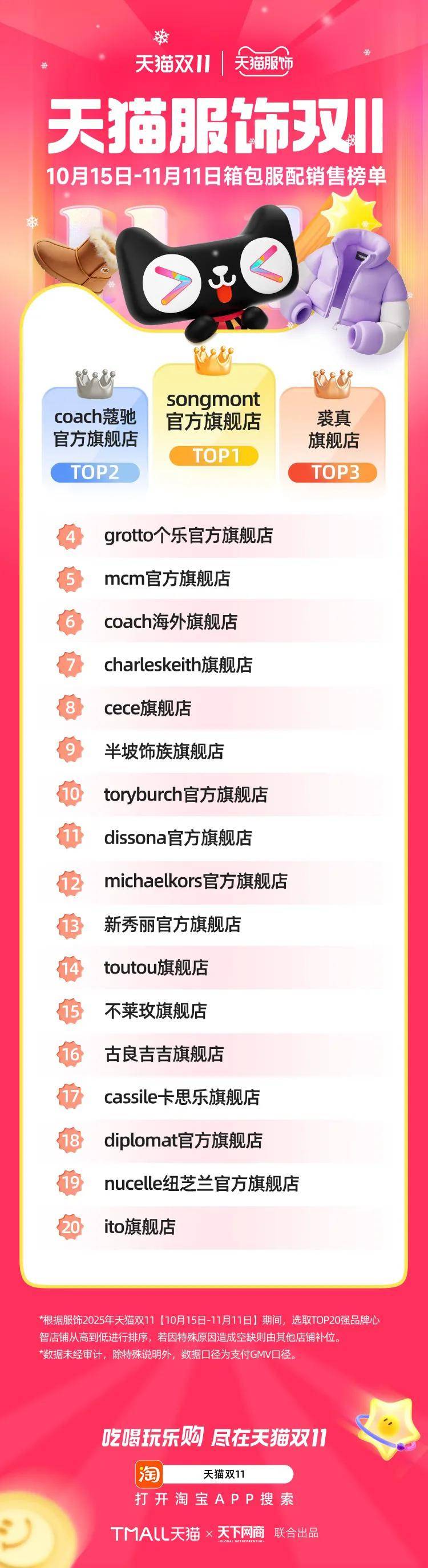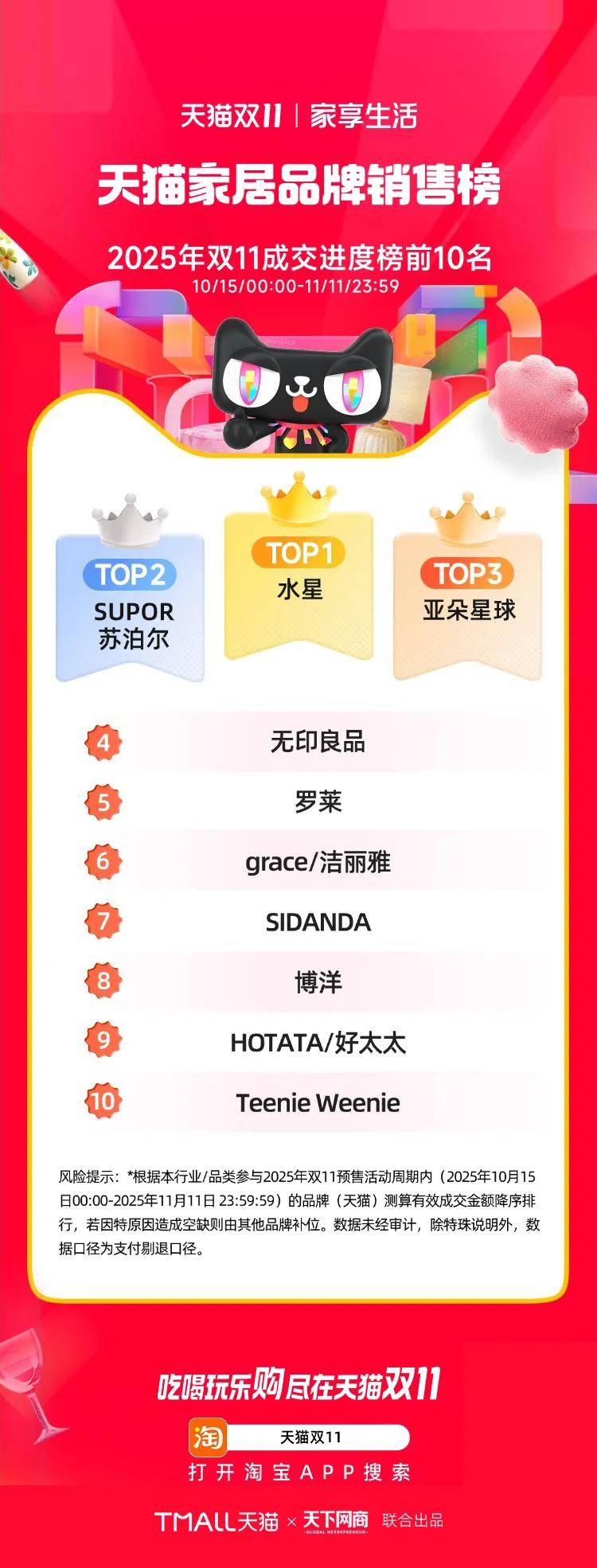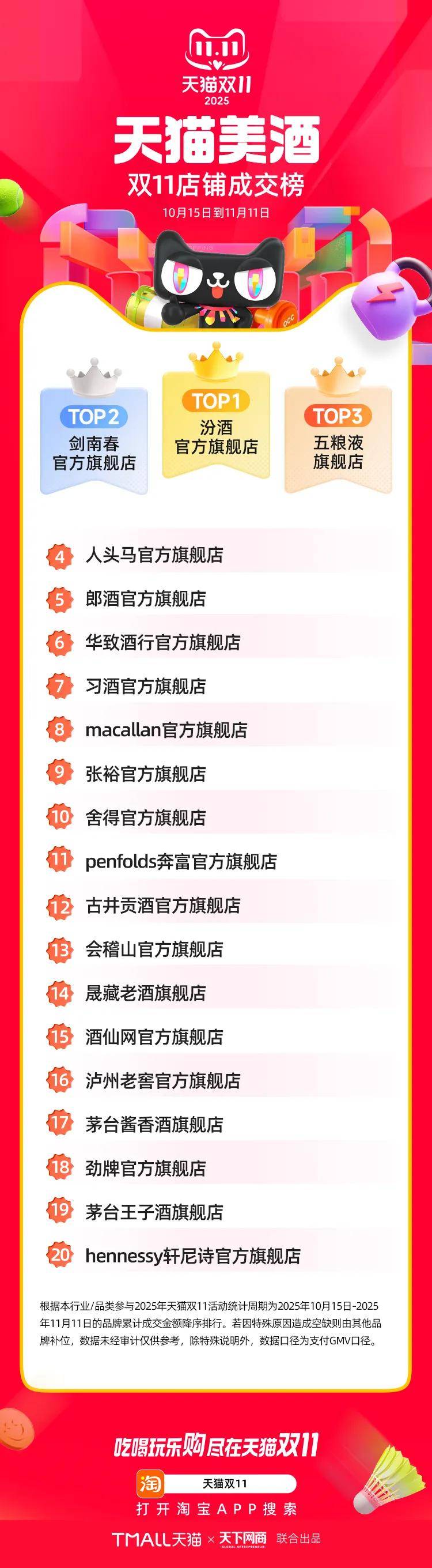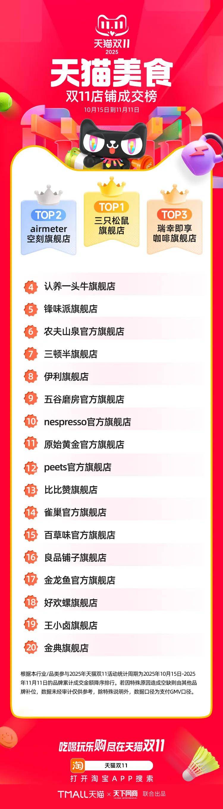 11月13日,2025天猫双11(10月15日-11月11日)品牌成交排行榜出炉,快消、服饰、运动户外、家享生活、3C数码、玩具潮玩、宠物、食品生鲜、汽车、珠宝饰品、天猫国际等行业的领跑品牌、商家出炉。