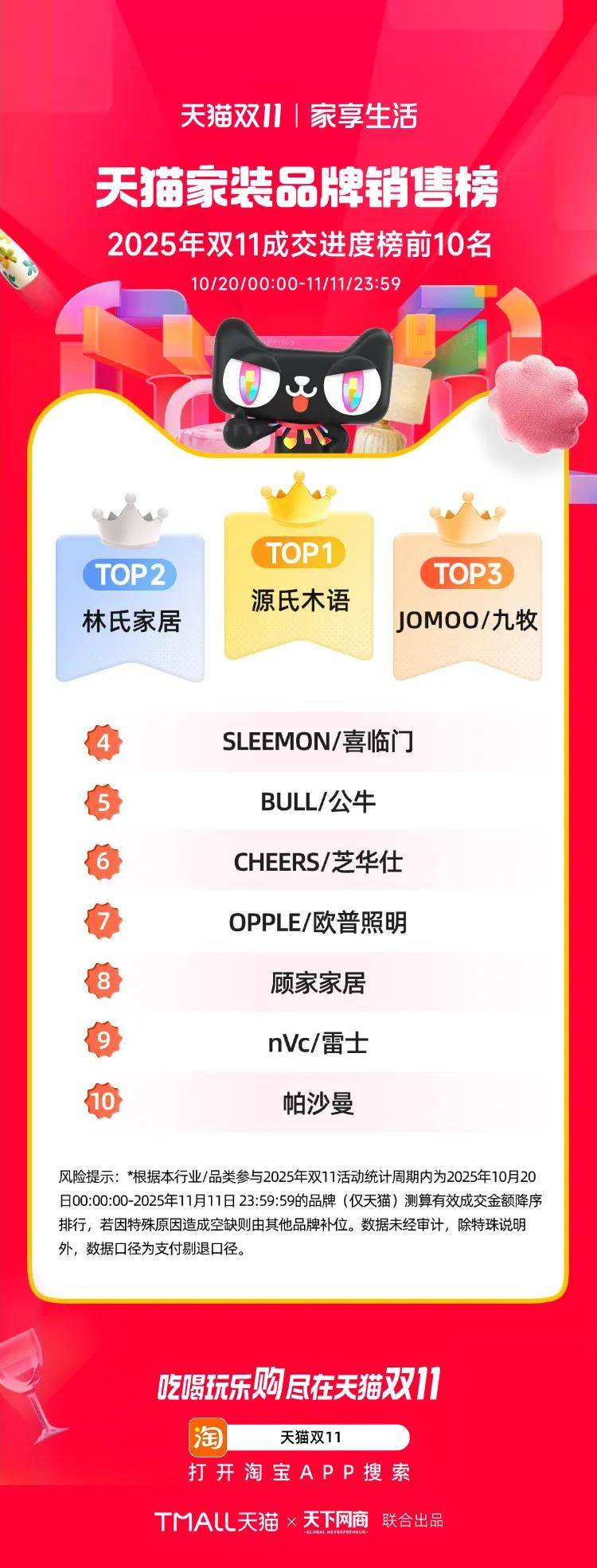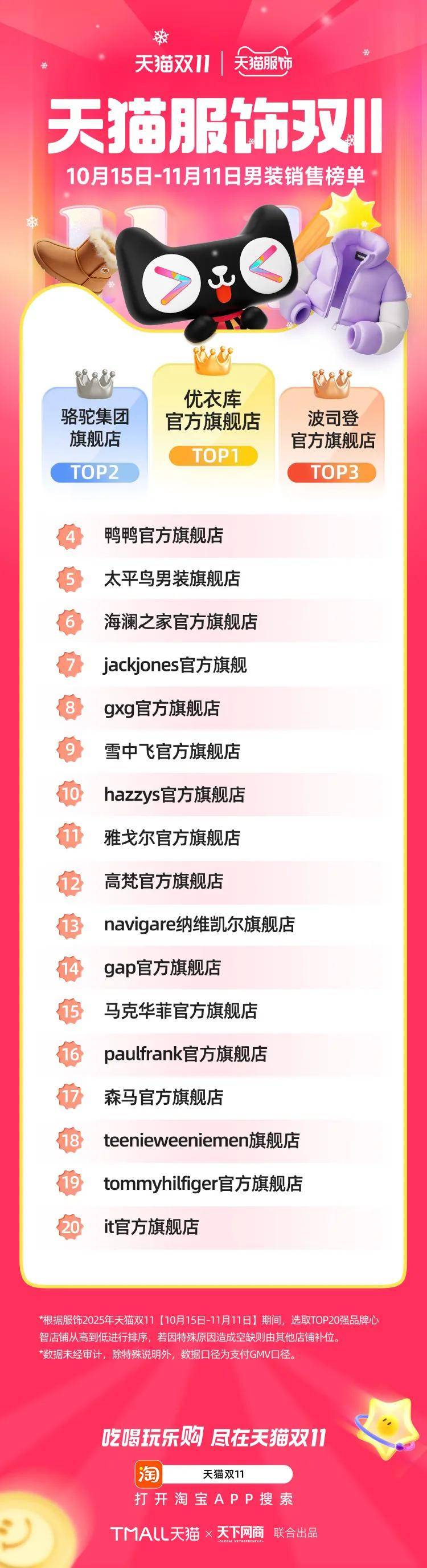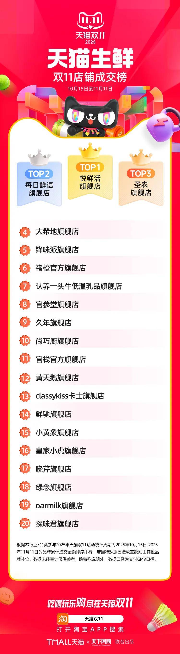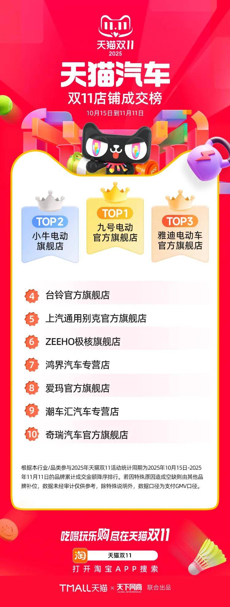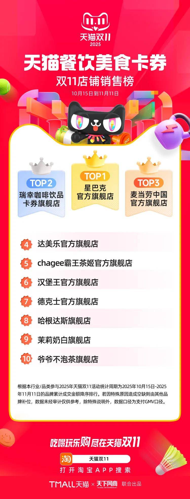 11月13日,2025天猫双11(10月15日-11月11日)品牌成交排行榜出炉,快消、服饰、运动户外、家享生活、3C数码、玩具潮玩、宠物、食品生鲜、汽车、珠宝饰品、天猫国际等行业的领跑品牌、商家出炉。