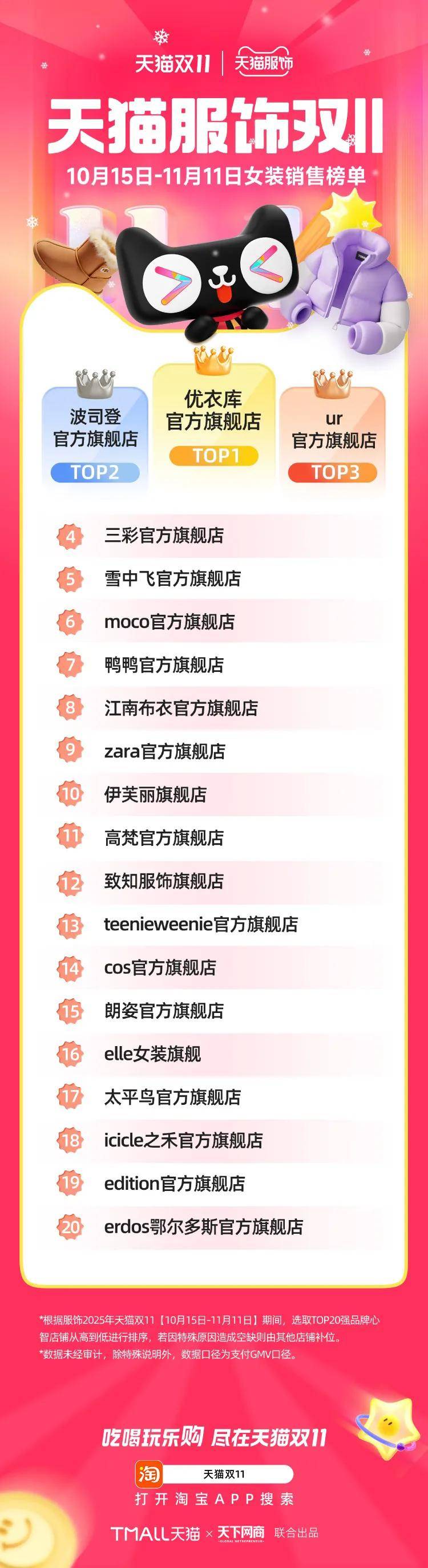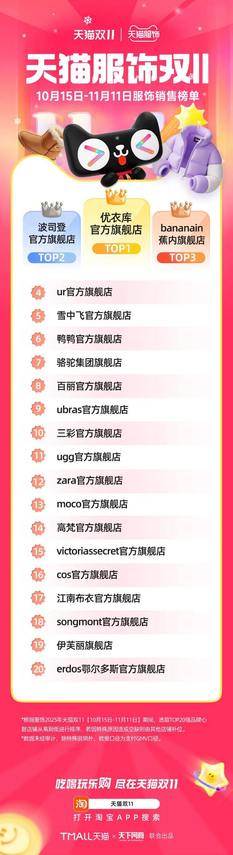 天猫服饰榜单中,优衣库、波司登、蕉内拿下前三,雪中飞排名大幅跃升位列TOP5;运动户外排行榜中,斐乐、耐克、阿迪达斯位居前三,Lululemon进阶TOP4;