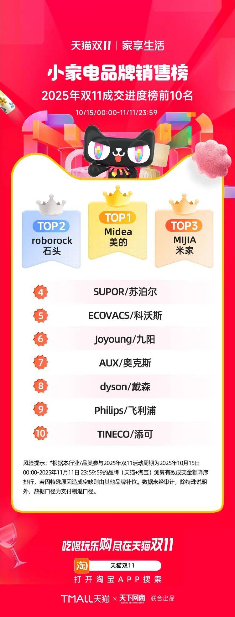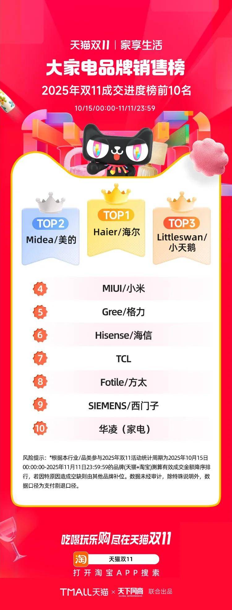 目前天猫双11仍在进行,全周期将于11月14日结束。以下为《天下网商》联合天猫发布的2025年双11(10月15日-11月11日)品牌成交排行榜,祝商家们大卖。