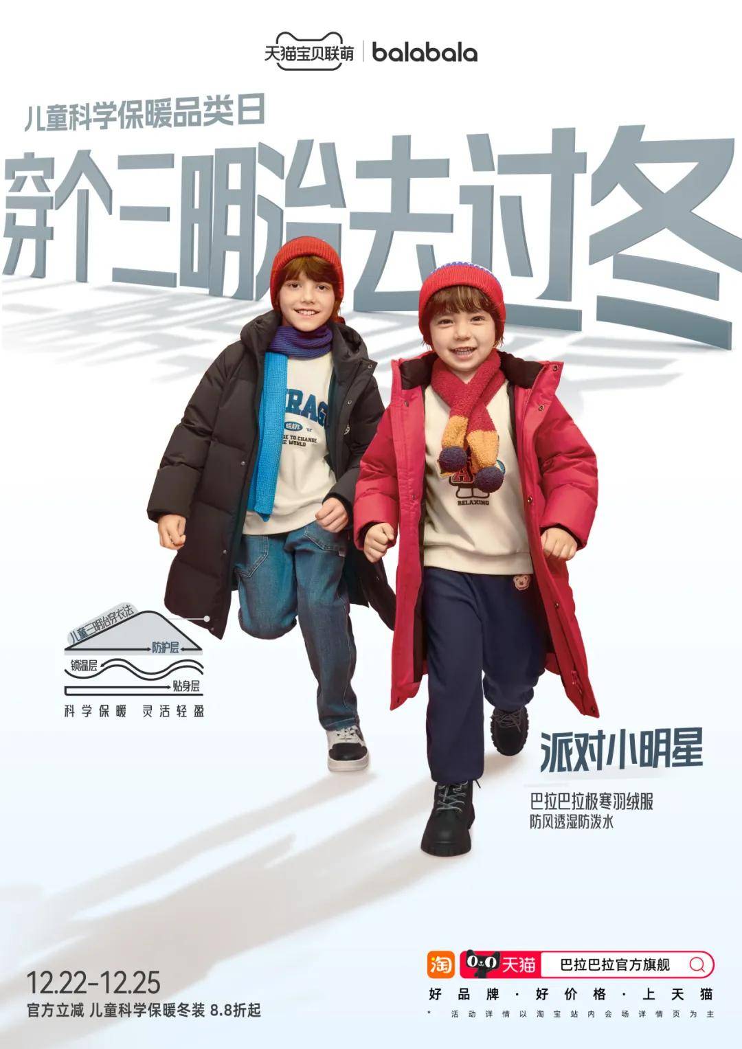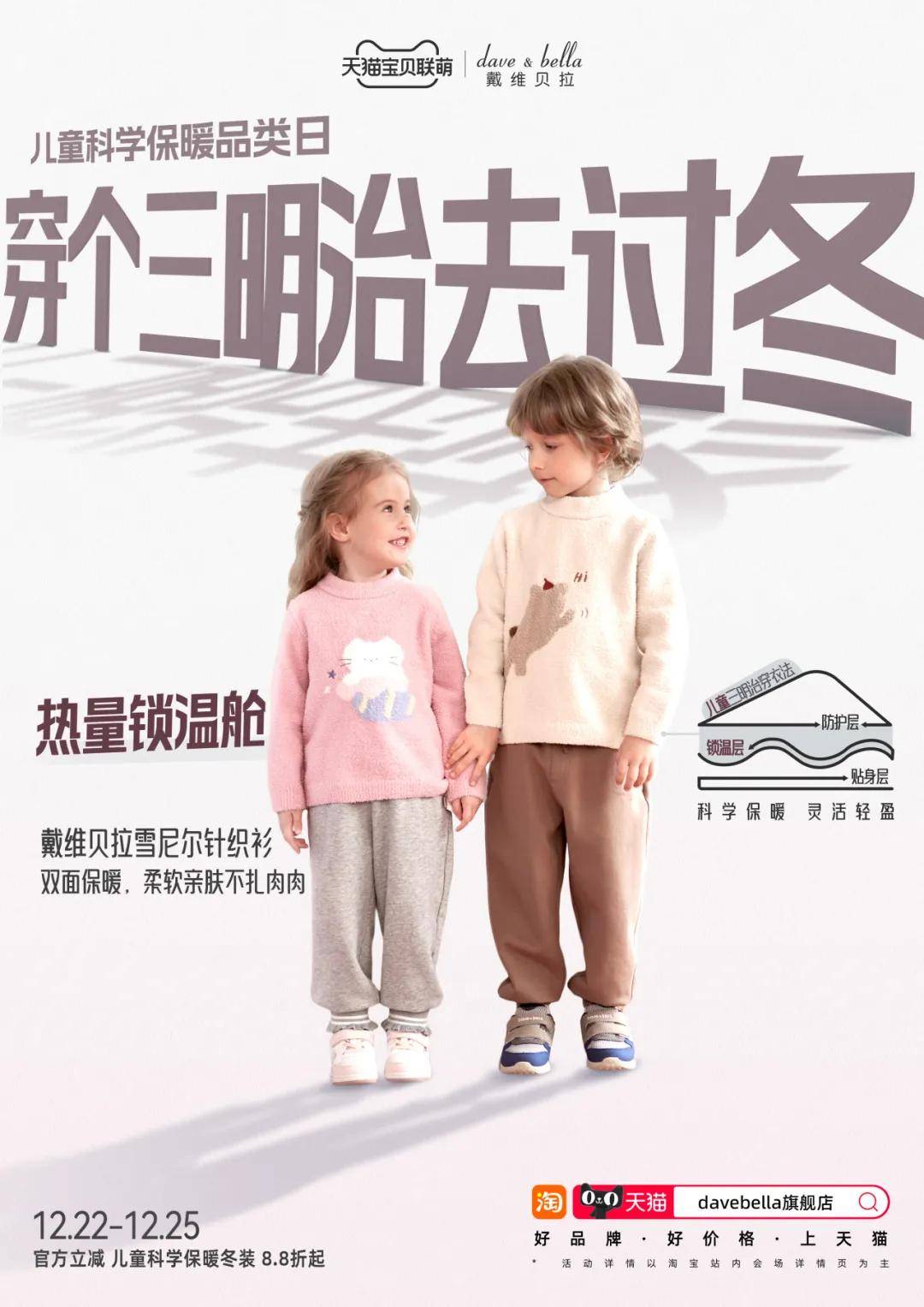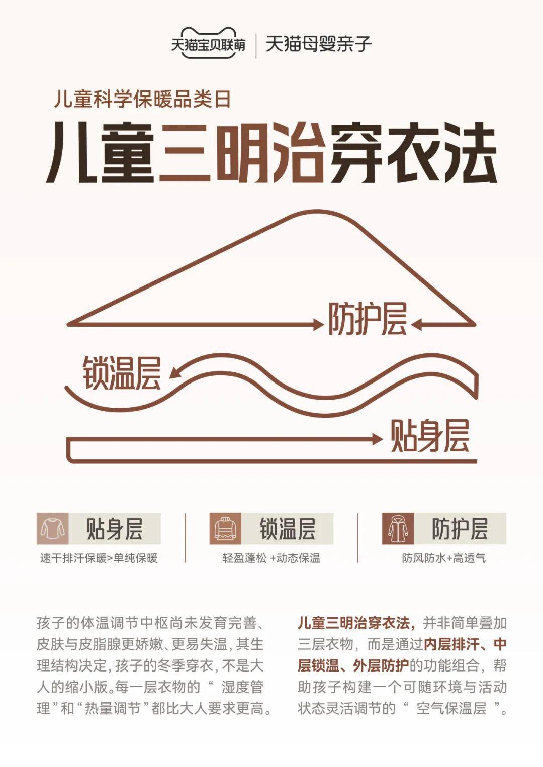 电商代运营公司-告别冬季盲目穿衣,天猫“儿童三明治穿衣法”引领保暖科学化摘要: 从经验主义到科学保暖,儿童冬装全面升级 寒潮席卷,上海95后妈妈思忆给3岁儿子挑选冬装时,会查看面料安全等级标签,反复比对充绒量与绒子含量,同时会关注三防、自发热等功能。 “老一辈觉得穿的越厚越暖,现在才知道孩子代谢旺盛,选对材质和穿法比单纯加衣更重要。”思忆的选择,正是当下年轻父母育儿观念转变的缩影,儿童科学穿衣法正从育儿圈层的专业共识,逐渐成为大众消费市场的新潮流。 孩子的皮肤角质层仅为成人三分之一,皮脂腺分泌不足成人一半,热量易散失且新陈代谢速率是成人的1.5倍,加上孩子们天性爱动,跑跳不停,活动量远大于成人,爱出汗却缺乏成熟的体温调节能力,一动大汗、一静畏寒的痛点尤为突出。传统堆叠式穿衣容易带来闷罐效应,难以适配儿童的生理特点与活动需求。也由此,儿童衣物对“湿度管理”和“热量调节”的要求更高。孩子保暖逻辑和普通成人不同,而是更类似户外运动人群。 天猫母婴亲子行业童装童鞋小二表示,孩子活动状态更多:教室里安静上课、课间嬉闹、体育课跑跳、周末户外活动等等,应对不同状态,更需要能够适配环境、动静状态的保暖体系。这个冬天,天猫联合十大童装童鞋品牌,打造“儿童三明治穿衣法”科学保暖冬装品类主题日。 为了让家长们选购时有更明确的选购标准,天猫推出了高于国标的新团标:《高品质婴幼儿及儿童保暖内衣团体标准》、《儿童羽绒服新团标》。对儿童家居服的抑菌率、透气率、柔软度、抗静电等维度做了更高要求;羽绒服也从基础安全的银标、品质升级的金标,再到黑金标顶级标准,形成覆盖不同需求的品质梯度。 将科学保暖理念转化为可实践的消费导购,天猫提炼出「雪地守护战甲」、「派对小明星」、「热量锁温舱」、「呼吸感小暖皮」四大趋势赛道。其中主打“三防御寒”的雪地守护战甲赛道,聚焦孩子户外玩雪、上学通勤等场景,主推防风防水以及轻量化防护的外层单品;主打“时尚有型”的派对小明星赛道由此延伸,将功能面料与潮流设计结合;主打“锁温发热”的热量锁温舱赛道则聚焦轻量化锁温材质,适配灵活穿脱;而孩子运动后贴身层闷湿易滋生细菌的痛点,让“抑菌干爽”呼吸感小暖皮赛道成为刚需,该趋势主打透气抑菌的功能型内层。 各大品牌基于自身材料和技术的优势,也推出了更符合科学保暖理念的儿童冬装。 高梵Kids童装总经理木兰直言:「科学守护,而非简单包裹」是品牌一直坚守的初心。当产品能精准匹配一个具体场景的痛点时,就会超越单纯的需求,成为父母的首选。今年冬季,高梵KIDS“黑金小火山”系列因其防风防泼水面料和科技保暖的经典设计,成为小朋友冬季出行场景的首选;“小童精灵帽”系列也因对新锐色彩的精准把握和便携性,成为搭配亮点和爆款单品。 左西总经理吴文华也敏锐察觉到了市场变化:“冬季穿搭已从够厚转向场景化以及功能化,家长选购时会同步关注轻量保暖、防风防水等多个维度。”左西推出小火炉3.0羽绒服以四层升级结构,实现轻、暖、透、耐用的平衡,满足孩子上学、户外、运动等多场景穿着。 “波司登童装非常认可天猫此次想传递的儿童三明治穿衣法理念,这与品牌长期以来坚持的专业防护、科技创新的发展方向高度契合,”波司登童装产品部总监陶丽娟表示。在参与此次品类日前,品牌已通过大数据分析发现,消费者对于儿童冬装的细分功能需求尤为关注,如极寒防护、轻量保暖和抗菌防污。今年,波司登也推出了与中国先锋设计师陈安琪的新年联名系列,将马年印花与纳米四防科技相结合,科技先锋的同时也更有中国年味。同时,极寒系列也升级第六代极寒技术,首创BOBO黄金角,选用680+高蓬松度羽绒,实现专业级防风防水与透气排湿的平衡。 不仅要保暖,更要兼顾美学需求。TEENIEWEENIE KIDS品牌负责人单姗介绍,品牌不仅希望提供经典美学,更致力于针对儿童痛点提供专业解决方案。活动期间,品牌主推经典学院风功能科技系列,将功能科技融入品牌设计,用高效防风透湿面料实现既好看又好穿。 jellybaby则聚焦一站式穿搭,其新年红系列涵盖外套、背心裙、打底衫等单品,实现从内搭到外套一站配齐。巴拉巴拉天猫淘系负责人陈均表示,品牌新触达的场景拓展型家庭,格外追求家庭场景一致性与美学和功能性结合,这也成为品牌产品设计的重要考量,活动期间,旗下面包羽绒服凭借时尚与实用的平衡收获市场认可。 三明治穿衣法的中层更加关注热量锁定与轻量化。戴维贝拉主推的雪尼尔毛衣采用强捻工艺和高支紧密纺,用科学织物结构锁温而非堆叠厚度。茵曼童装的品牌卫衣内里加厚加绒,锁温又亲肤的同时,融入锦鲤、小猫等新年元素,兼顾功能与颜值,旗下小茵曼毛衣凭借柔软舒适的材质成为家长热门选择。 三明治穿衣法的贴身层关注的不仅仅是保暖,更要兼顾到儿童更娇嫩的皮肤特性,打造呼吸感小暖皮。此次活动期间,英氏推出了儿童内衣套装新年款礼盒,采用“天然面料×玻尿酸黑科技”,兼具7A抑菌与高透气性能,更标准的满足了家长对儿童贴身衣物透气、抑菌、保温的健康诉求。 天猫围绕科学保暖的核心,打造了内容种草、场景渗透以及转化的传播矩阵,既让科学穿衣理念深入人心,也为参与的